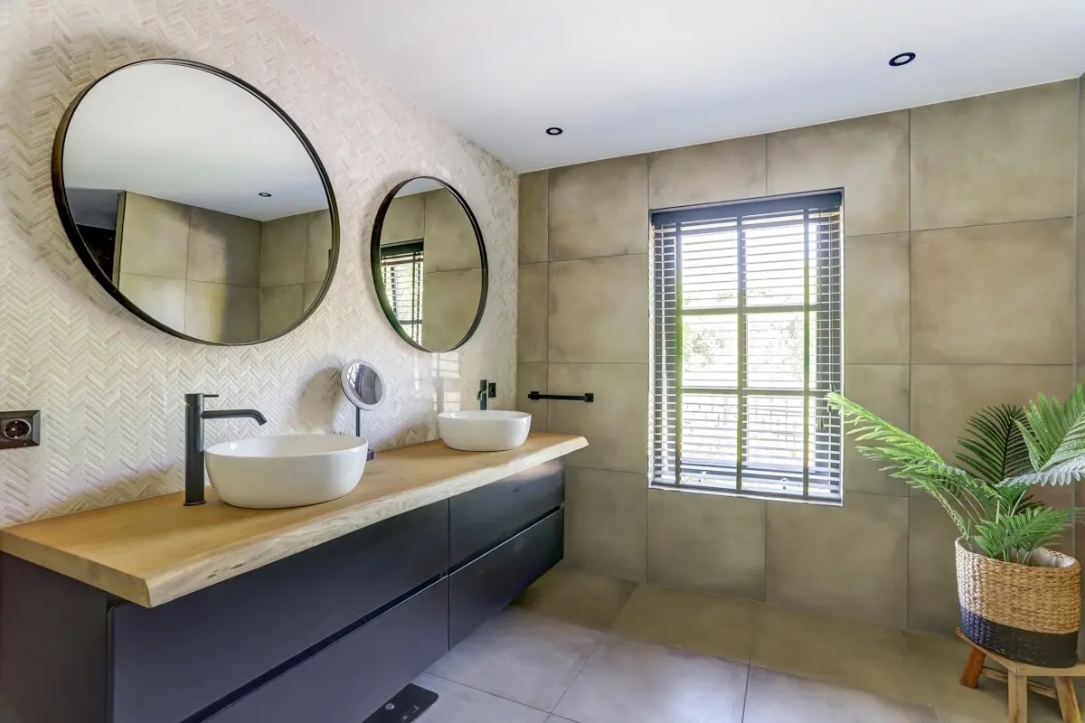 En dan de badkamer. Die is werkelijk gloednieuw en een plaatje om te zien. Onder de schuine kap, met twee dakramen die het daglicht rijkelijk binnenlaten, treft u een strak vormgegeven ruimte met een moderne inloop-stortdouche, een stijlvol wastafelmeubel met houtlook laden en dubbele kranen, een toilet én die serene hotel-vibe waar u ’s ochtends net wat makkelijker uw bed voor uitkomt. Elk detail klopt — van het tegelwerk tot de ronde spiegels.